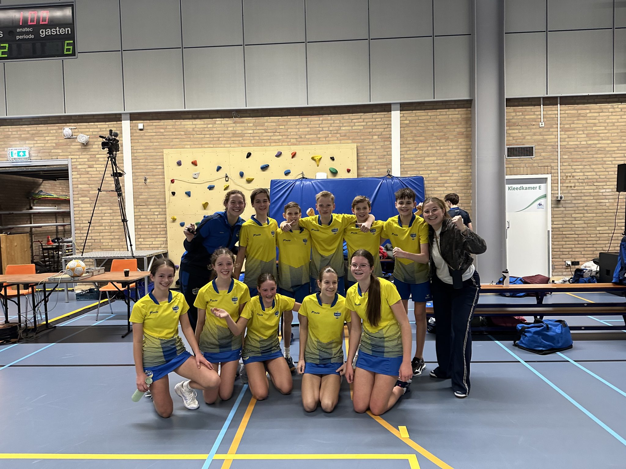 Valto J5 lijkt ook gebrand op de overwinning. Ze staan onderaan, en willen van die laatste plek. De wedstrijd begint gelijk op hoog tempo met een goede defensieve organisatie van Ondo. Emma verdedigd waarna in de aanval Eva Z scoort door een slimme Assist van Thom. Daarna snel 1-1. Eva D geeft een mooie Assist op Pepijn. Daarna een iets wat makkelijk gegeven strafworp voor Valto. 2-2… Van de prima fluitende scheids gaat Ondo J5 het natuurlijk niet cadeau krijgen.. Ze moeten dit klusje zelf klaren. Thijs scoort op aangeven van Jill.. Eva Z vangt af en scoort gelijk!!